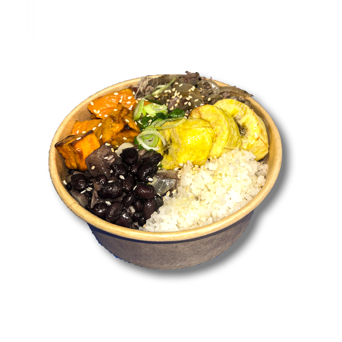 Échine de porc longuement marinée et mijotée au jerk seasoning jamaïcain, relevée d’ail, de gingembre et d’oignon. Servie sur un lit de riz, accompagnée de haricots noirs fondants à la Cubaine, de patate douce rôtie et de banane plantain dorée, pour un bol généreux, parfumé et subtilement épicé aux saveurs des Caraïbes. Un plat relevé mais sans exageration, mais relevé quand même!