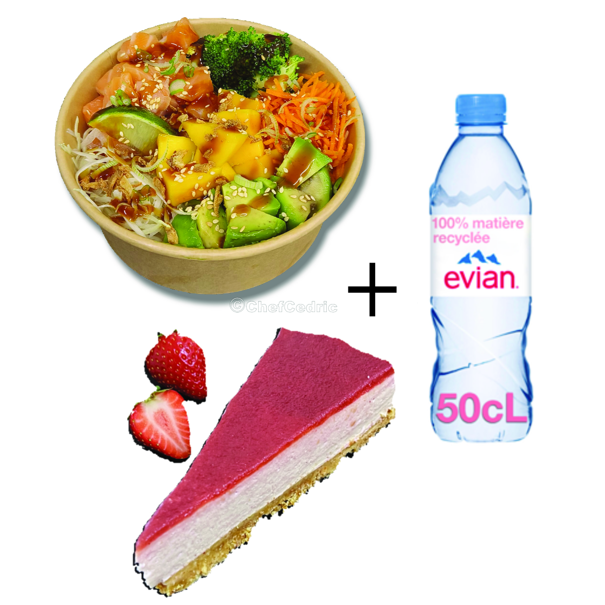 poké bol saumon, vermicelles de riz marinés, mangue, avocat et edamame, relevés de chou vinaigré. Sauce hawaïenne maison, sésame et oignons frits Avec une boisson et un dessert de votre choix
