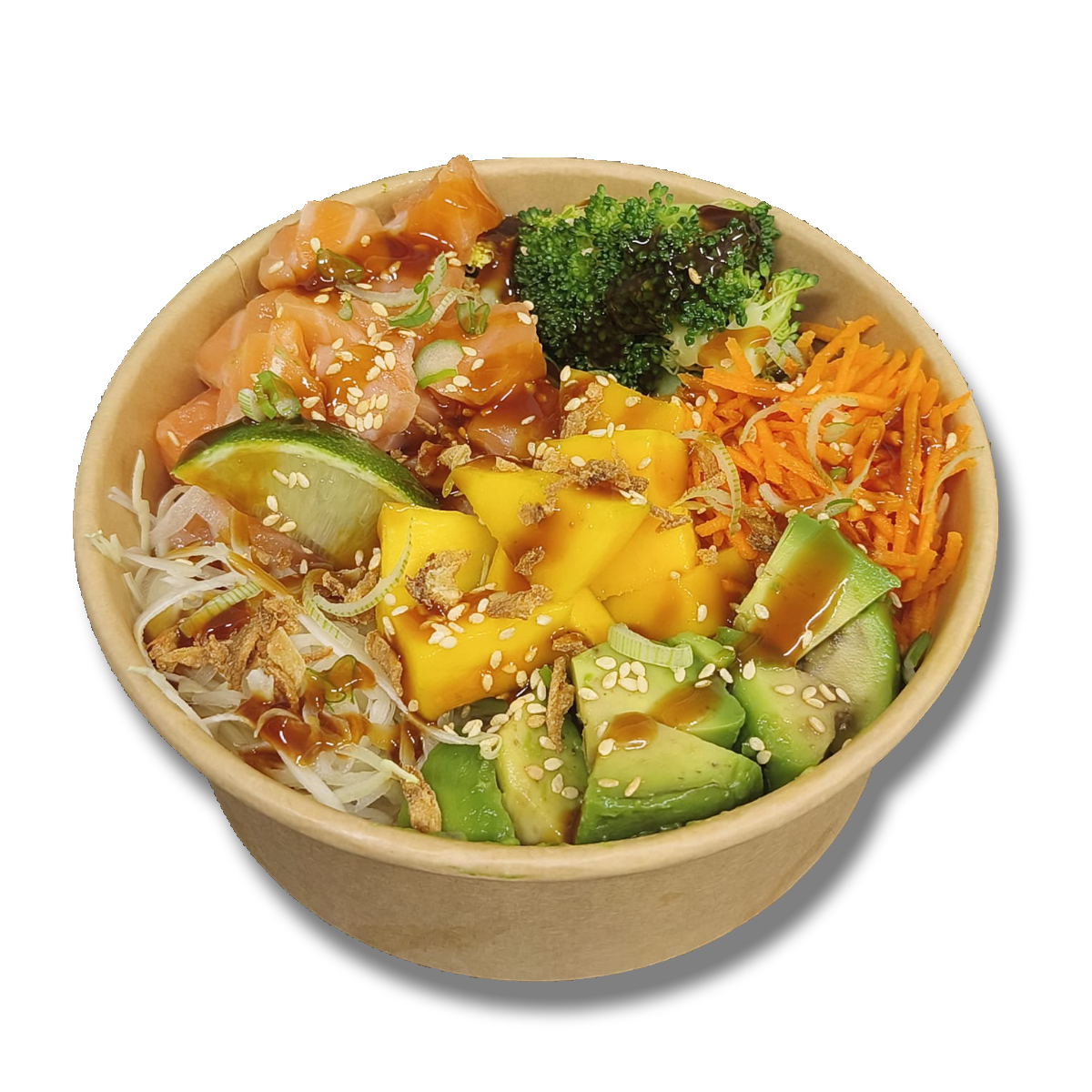 Dés de saumon déposés sur des vermicelles de riz marinés, mangue, avocat et edamame pour la douceur, chou blanc et carottes subtilement vinaigrés pour la fraîcheur.